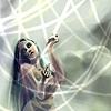 Description: A dark-haired woman weaving strands of light